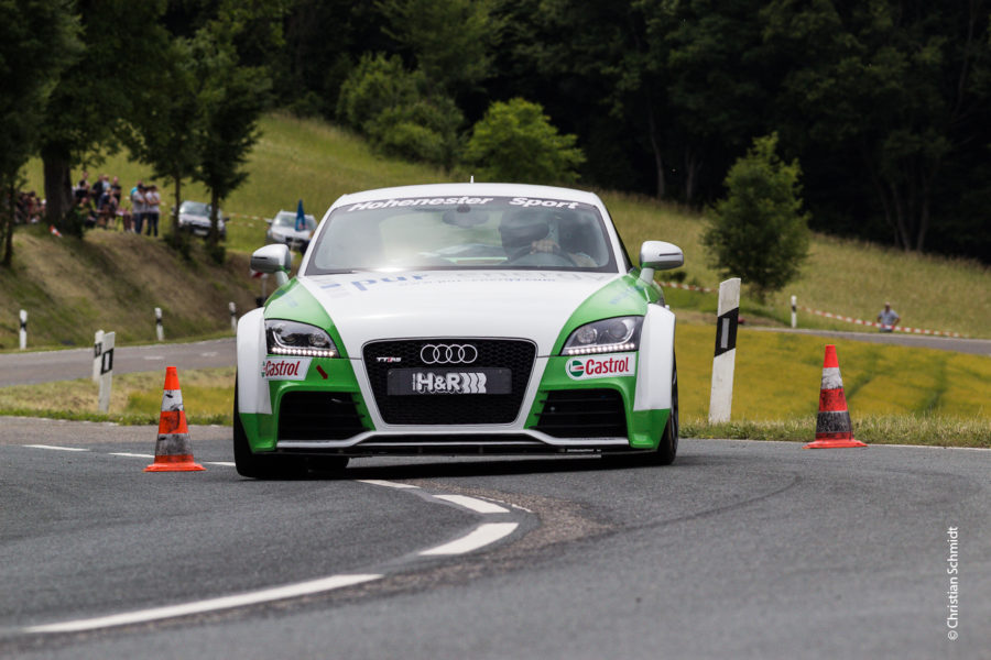 Gegen Mittag gingen die ersten Fahrzeuge der Gruppe F an den Start. In der Gruppe F ging es dann schon ganz anders zur Sache: höhere Geschwindigkeiten und spektakuläre Fahrzeuge wurden geboten. In der Gruppe F sicherte sich Jörg Kuhn aus Neustadt/Aisch den Klassensieg. Mit seinem Audi TT RS ließ der Neustädter sämtliche Konkurrenz hinter sich und stellte zur aller Überraschung auch noch einen neuen Streckenrekord auf! Mit 8 Sekunden Rückstand kam Klaus Barth (BMW E30, Lichtenfels) vom MSC Scheßlitz auf Rang 2, dicht gefolgt von Kevin Böhnlein (BMW M30, Knetzgau) der für den AC Schweinfurt angetreten war. Patrick Orth vom Mitveranstalter MSC Zellingen schaffte dieses Jahr leider nicht den Klassensieg und landete auf Platz 9.